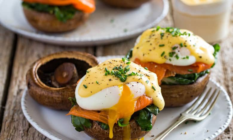 Indulge in a classic French-inspired breakfast with a modern twist – traditional eggs florentine. This easy-to-make dish marries the rich, earthy flavours of portobello mushrooms drizzled with olive oil and garlic with the vibrant, fresh taste of Swiss chard and smoked salmon or trout.