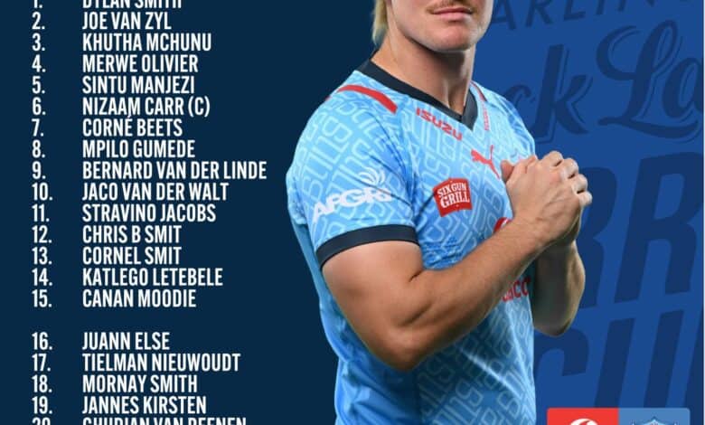 BULLS vs LIONS STARTING XV: 1. Dylan Smith, 2. Joe van Zyl, 3. Khutha Mchunu, 4. Merwe Olivier, 5. Sintu Manjezi, 6. Nizaam Carr (c), 7. Corné Beets, 8. Mpilo Gumede, 9. Bernard van der Linde, 10. Jaco van der Walt, 11. Stravino Jacobs, 12. Chris Barend Smit, 13. Cornel Smit, 14. Katlego Letebele, 15. Canan Moodie.