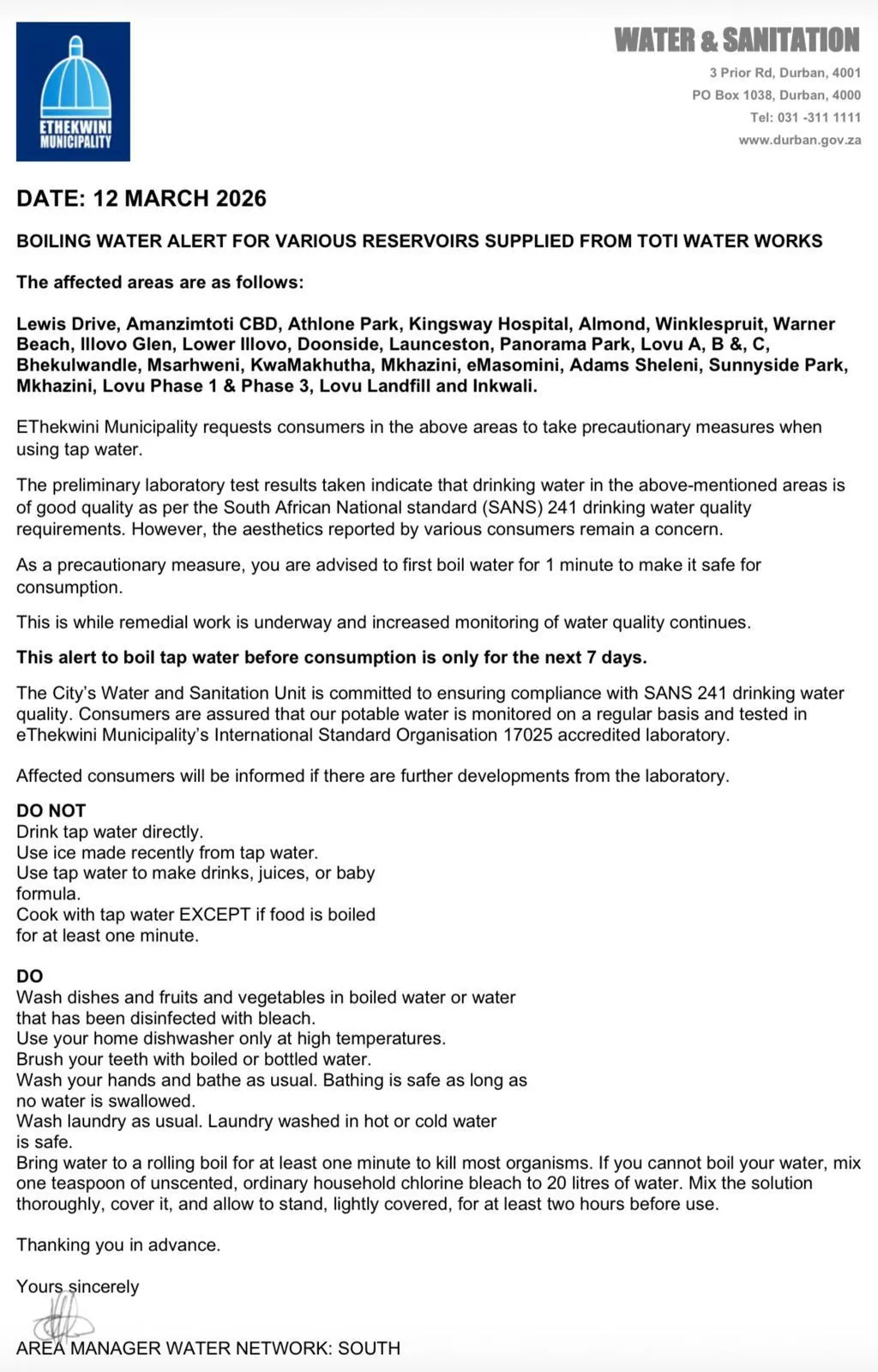 Residents in several parts of Durban have been advised to boil tap water before drinking after the eThekwini Municipality issued a precautionary water alert.