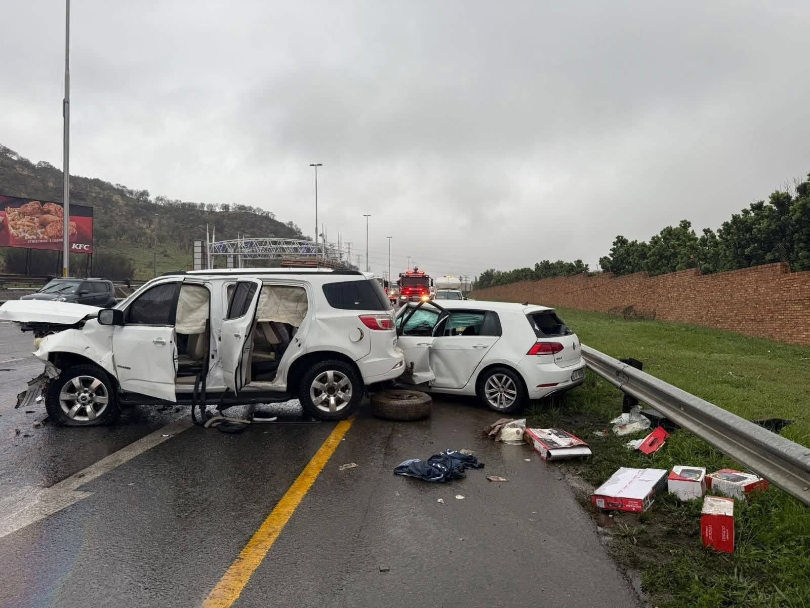 The accident, which involved a sedan and an SUV heading east towards Ekurhuleni, unfolded in the kind of conditions every Joburg driver dreads heavy downpours, poor visibility and howling winds that have battered large parts of the province since the weekend.